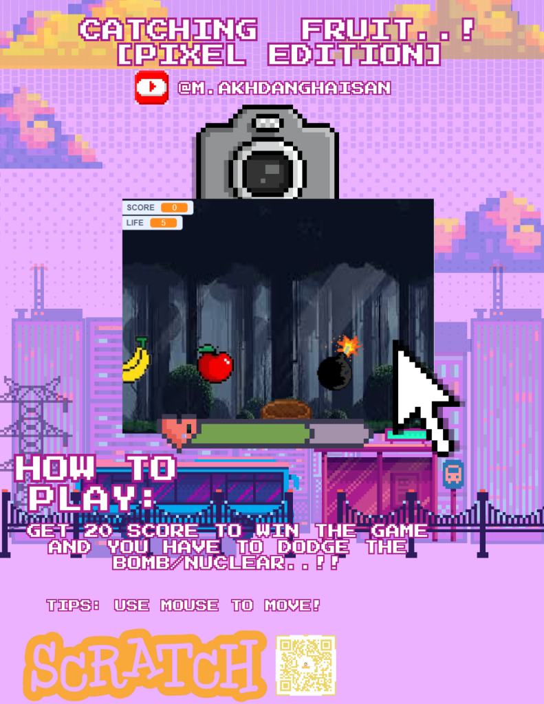 Hello Everyone, Today I will show you guys my game, Catching Fruit [PIXEL EDITION]. It’s like a catching fruit game, but it’s a Pixel edition. Inside all is pixel, so that’s why I named it [Pixel edition], and Catching fruit is a game where you catch falling fruits while avoiding other objects. This game helps you to train your reflexes too, because you have to catch the falling fruits with your mouse pointer. The main goal in this game is to get the score to 20, and there is an enemy in the game, which is a bomb, and a nuclear bomb. You have to dodge the enemy, and if you have 5 life, if your life is 0 your will lose the game. if you touch the bomb, you get -1 life, and if you touch the nuclear bomb, you will get -2 life and this game made in Scratch.mit.edu and took about 4-5 hours to make. You can play by search it on the scratch Catching Fruit [Pixel Edition in Scratch by AkhdanGhaisanScratch Or scan the qr Code or click the link in the below.